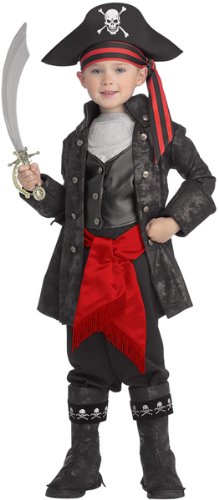The Black Pirate Child's Halloween Costume includes the jacket with attached vest, pants with attached boot tops, pirate hat, and waist sash as shown.Check its out related products of Pirates of the Seven Seas Child's Captain Black Costume, Small